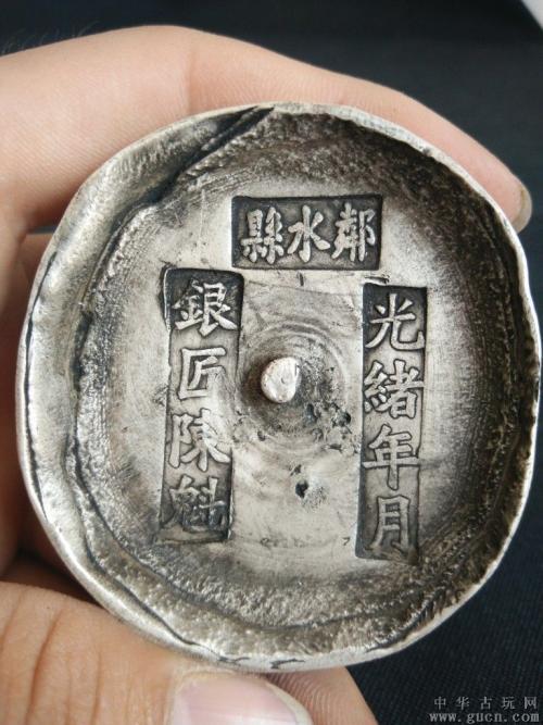 各种银锭因铸造工艺的不同,成型后的情况也不同,制假银锭,往往工艺与过去不一致,因此,成型后的情况也不同如果不是真银制假那更不相同。如一是五十两的双翅银锭,成型后双翅层次分明,宝气光亮;锭面中心常常有一个小凹,但将型模倾斜固定于一边的中心无凹状,这类器型底部和侧部一般有蜂窝状,又如锭面凸出无丝纹的银锭器形。主要有两广、云南槽银、牌坊银,河南腰锭、山西晋泰锭等,这类银锭的特点是锭面平滑、呈溢满状凸出,四边是圆弧状角,侧面有重纹,槽银底部蜂窝状有的不明显,甚至没有,但牌坊锭底部有蜂窝状。三是锭面凹陷无丝纹,中心有奶头状的银锭器形,主要是以四川为代表十两圆锭型,底部蜂窝状明显。四是锭面微凹并有丝纹的器形,这类一般是碎银,银的成色达9成色以上就会有丝纹形,9成色以下者银的层色越低,说越无丝纹银。银锭的底部和侧的蜂窝状大小、多少、深浅是鉴别真假银锭的又一重要依据。凡蜂窝较深、较密、洞内圆润光亮,有回珠,有彩色光泽者必是真银锭,银合金银锭一般没能上述特征,如果蜂窝中灰黑一片,可能是铅等假锭。蜂窝状凡是自然形成的必然是口小洞大,深浅不一,人为制造的蜂窝状正好相反。