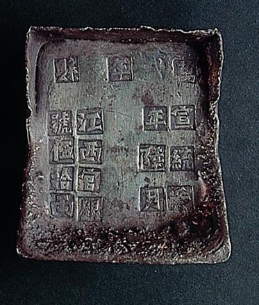 清代江西全省通用的银锭形制有方锭、镜面锭、圆碗锭等多种,这枚江西方锭,锭长8.92厘米,宽7.25厘米,高5.86厘米,重1889克。器型呈正方形,四周边叠起,面大底小。锭面铭文“万载县·光绪二十四年腊月·伍十两匠刘春”,铭文戳记清晰,排列很有规律,上横列地名,右为纪年,左为匠名和纪重。此种大方锭是清代自道光以来江西一些府、县的税课银锭,每锭重五十两左右,这种造型后来发展成为江西官钱局银锭的固定器型。按张家骧《中华币制史》载,江西方宝每锭重洋例平五十两,洋例平两重36.53克,则江西方宝每锭应重1826.7克,但实际上江西方宝每锭实重均在1855克以上。江西方锭在清道光年间已经出现(存世的江西方锭还见有嘉庆纪年的),这时的铸造地点是众多的,分散在全省各个州府。到同治至光绪三十年,方锭的铸造地点相对集中在万安、万年、万载三地。光绪二十八年设立江西官钱局,稍后又设立官银号,代为各县铸造银锭。次年官钱局并入官银号,改为官银钱总号,这时铸造的方锭都錾有“江西官银号”字样。1912年江西官银钱总号改组为民国银号,而此时中国货币结构发生变化,对银两的需求量大为减少,铸锭量也相继减少,方锭的铭文趋于简化,一般仅有“江西足宝”四字。江西五十两的方形银锭造型独特,这种造型仅有数省铸造过,深受银锭集藏者喜爱。