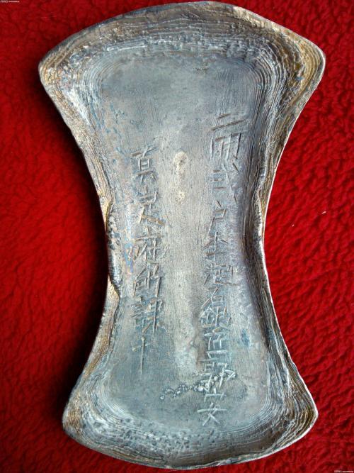 银锭铭文是指铸造银锭时錾刻或铸造在银锭上的文字,内容历代不尽相同,大体包括银锭铸造的时间、地点、用途、成色、官员或工匠姓名等。錾刻铭文是当时为了保证银锭的质量,用签字画押的方法,表示对经手的银锭负责。正因为这样,却成了我们鉴别真假银锭的重要依据。一是历代铭文有其特点,各个历史时代银锭上的铭文都与当时的货币经济紧密相联,与当时政府用银为货币的历史相一致,如汉代银锭铭文字少;唐代的银锭字开始多起来了;宋金银锭铭文较以前有了显著变化,用途也较广泛,很多银锭开始注明用途、地点、成色、匠人等铭文;元代用途进一步扩大,有了税课银徭役折银税等铭文。明代的铭文多涉及税银内容一般包括地点、时间、用途、重量、工匠、监铸押运官员等;清代和民国时期银锭铭文变化最大。