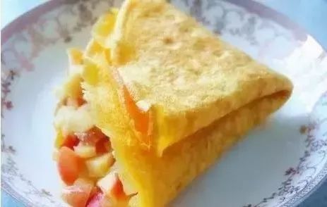 将苹果片铺在蛋饼上,待底部熟后再翻转煎,然后装盘。