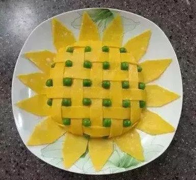 依次摆上花瓣,将事先煮好的豌豆挨个填充到向日葵的缝隙里,完美的向日葵炒饭就完成了。
