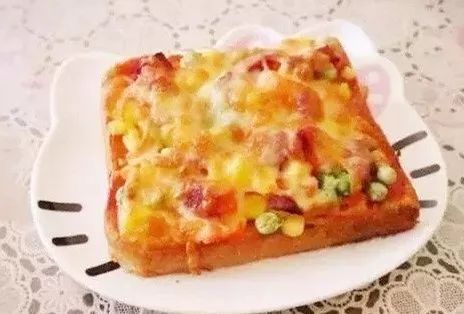 1将茄汁蘑菇肉酱均匀淋于吐司后,撒上起司丝。