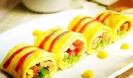 蛋饼底部刚凝固表面未凝固时,铺上炒好的火腿番茄丝和奶酪丝,马上用铲子卷成卷即可。
