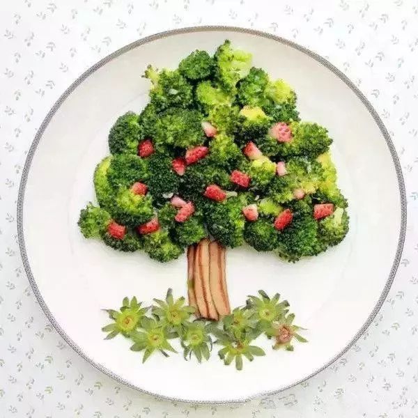 取一只白色空盘,西兰花摆成大树形状,胡萝卜作为枝叶的点缀。