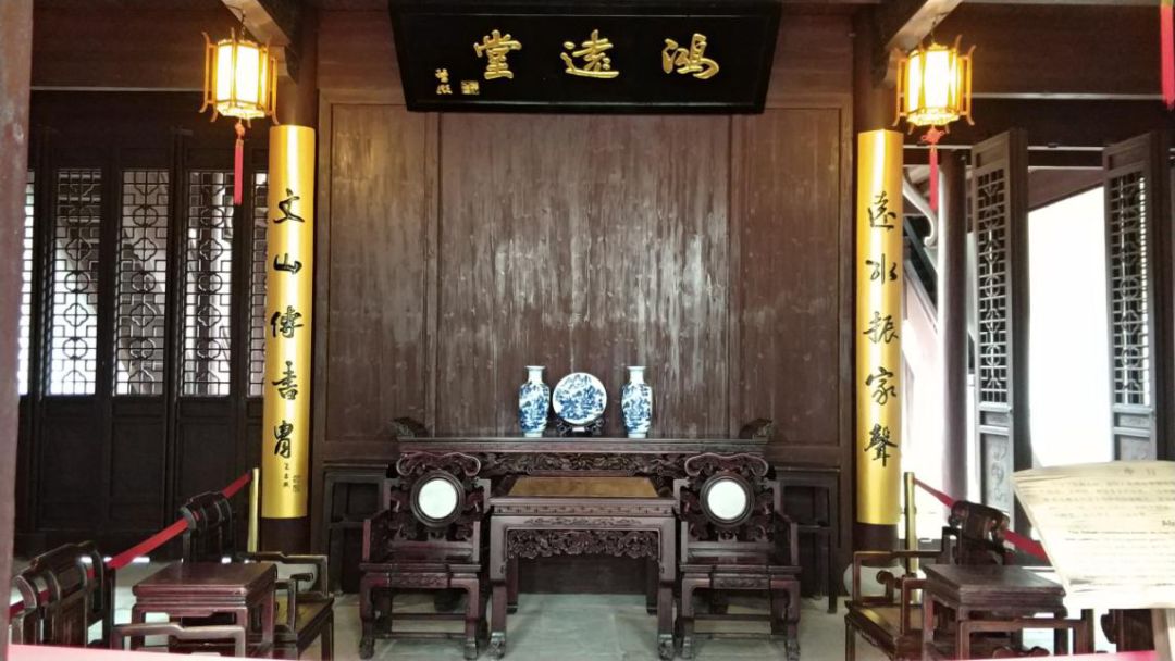 在荻港生活期间,陈果夫一直住在岳父朱五楼家,也即现在的鸿远堂里。鸿远堂大门朝南,上漆红色对联诗句两行:“远水振家声,文山传书胃”。门前有大石元宝一只,显示当时朱家的财势。往里有四开间三进深二天井,东边紧紧挨中堂的楼房是陈果夫与夫人朱明珠的住房,其下天井有石桌石凳,花坛等园林设施。园内环境十分静谧雅致,草木幽深,院墙高耸,将一切喧嚣隔绝在外,可谓是名副其实“深宅大院”。