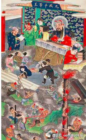 导读:地狱神,指管理阴间的天神;十殿阎君,民间俗称阎王爷,他们分别是第一殿秦广王、第二殿楚江王、第三殿宋帝王、第四殿五官王、第五殿阎罗王、第六殿卞城王、第七殿泰山王、第八殿都市王、第九殿平等王、第十殿转轮王。关于地狱、鬼魂之说,早在我国的夏商周三代之前,人们就相信天上有神灵(古称上帝),人死后成鬼魂,并加以供奉和祭祀等活动。到了春秋战国时期,人们相信在人死后,会到另外一个世界,即和阳间一样存在着的阴间,那里也有户籍、等级、男女、夫妻、美丑,有享福的,也有受罪的;有可以超升的,也有万劫不复的……。据道经记载,泰山之神东岳大帝、酆都大帝等,主管阴间鬼魂之籍及诸地狱之事。人死之后,由黑白无常、牛头马面将其带回交由判官审查,判官根据“生死簿”,校定善恶良莠,依一生所犯罪恶大小、多少、轻重的不同,将其发配到不同殿(指十殿阎君处)、不同地狱之中。或割头分身、断腕锯腿,或上刀山、或下火海;或投虎口、蛇咬虫啮,或削鼻挖心,或剔骨抽筋……。道教宫观供奉的阎君,一般多和城隍庙在一起,殿内除供十殿阎君外,大多还在墙壁上(或挂像)绘有十八层地狱图,以警示后人要“众善奉行,诸恶莫作”。以免死后受大劫难,遭大苦痛。