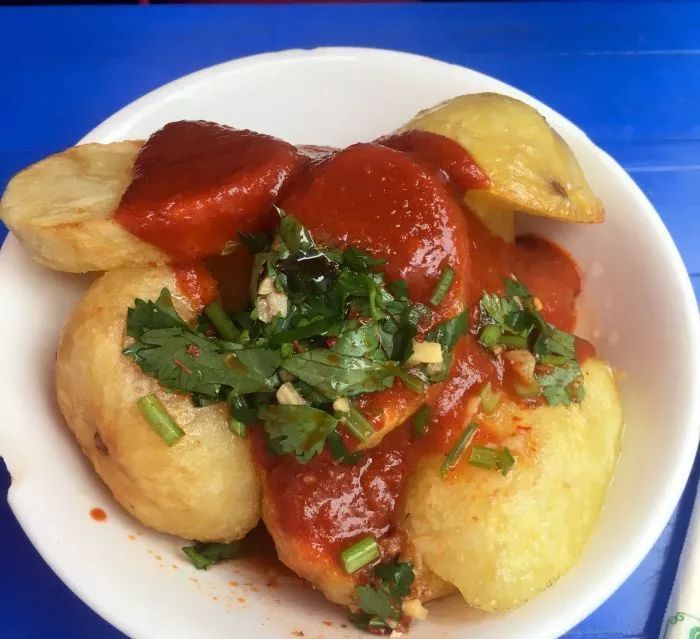 两三张桌子都摆在露天的地方,排队的人男女老少都有。6元一份炸土豆,5元一份炸豆腐都非常地道好吃,主要是蘸料又辣又很有味道,适合随便吃吃。