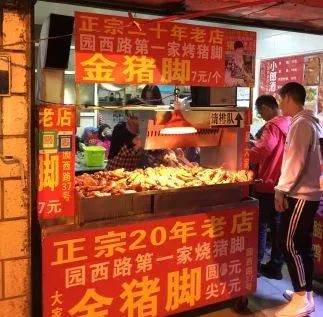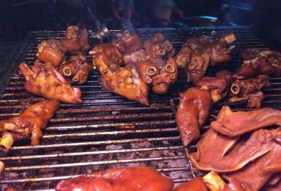 他们家是用卤好的猪脚,放在炭火上慢慢烤,直到表面金黄,咬上一口,外焦里嫩,满满的胶原蛋白。