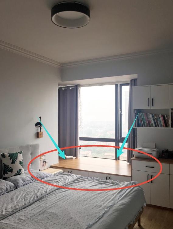 当初设计的时候,媳妇就硬把主卧的窗台“加宽”1m。所以就形成了现在的假飘窗区域,找的就是定制柜子的厂家做的,其实让木工师傅做也可以,定制的尺寸还是有点误差,不过可以选择的样式多,周期也长一些。