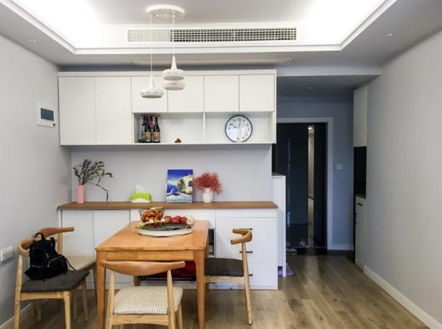 客厅的另一边就是餐厅了,客餐厅之间没有房梁,所以我们就整体在顶面做了一圈跌级吊顶,刚好也可以收纳风管机的出风口。灯带吊顶也非常有层次感,打开以后温馨漂亮极了。
