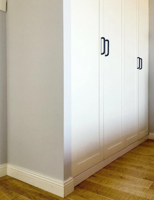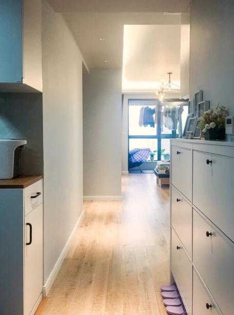 一进屋是我家的鞋柜区域,右手边是厨房,所手边这里的距离也不是很宽,于是就定制了一排浅浅的柜子,刚好陈列在入户门的左边,虽然窄了一些,不过还是可以斜插放入鞋子,存放当季的鞋子是完全足够了,底部留空也可以换常换的鞋子。