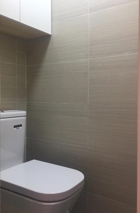 洗手台的右侧还隔出来了一个独立的马桶区,这样我家的厕所就是“双马桶”了,因为这边没有湿区,所以在马桶上方还装了收纳柜。入住后才知道实用,早上起来我和媳妇都要解大手,有了两个马桶就不用等待对方了,一人一个十分方便。