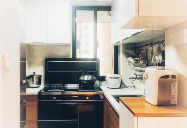 厨房的空间大概就是一个方形,所以做U型的橱柜刚好合适,在左边我们收纳了冰箱,右边是水槽,因为厨房很小,切菜的话就只能在水槽上面架上案板了,有那种专门的水槽案板。其次我们的灶台买的是集成灶,这样也可以节省一点空间,吸烟效果也特别不错。