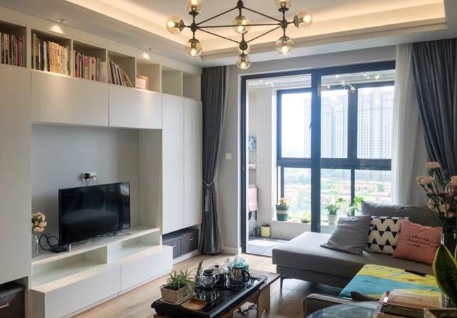 担心以后我们有孩子收纳不够用,媳妇就早早的在电视墙安排的一整圈的柜子,没有买成品的电视柜,最开始还在想要那么多柜子干嘛,但是如今才知实用,我们的客厅永远都是干净清爽的,因为有充足的收纳,所以东西不会乱丢乱放了。