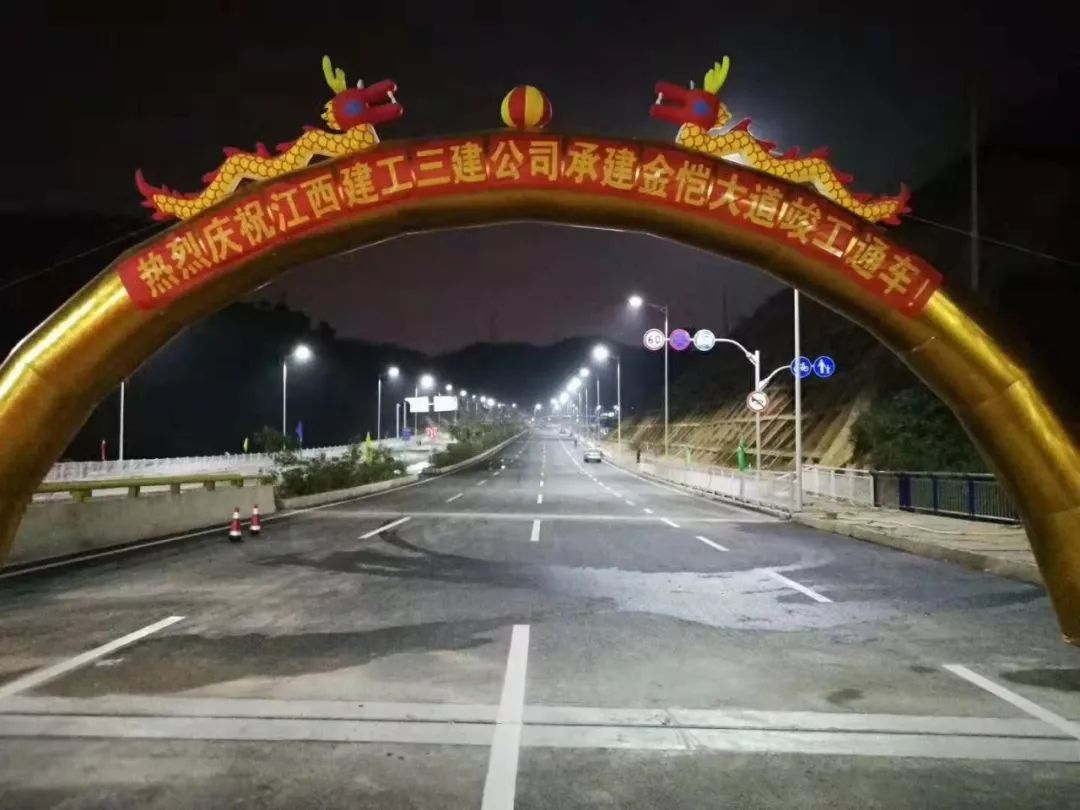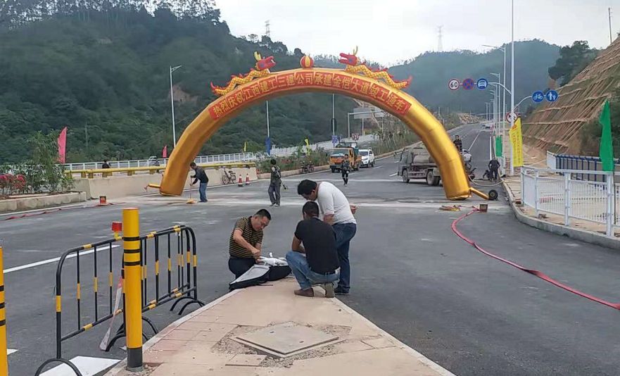 金恺大道现场已经竖起庆祝通车的充气拱门,