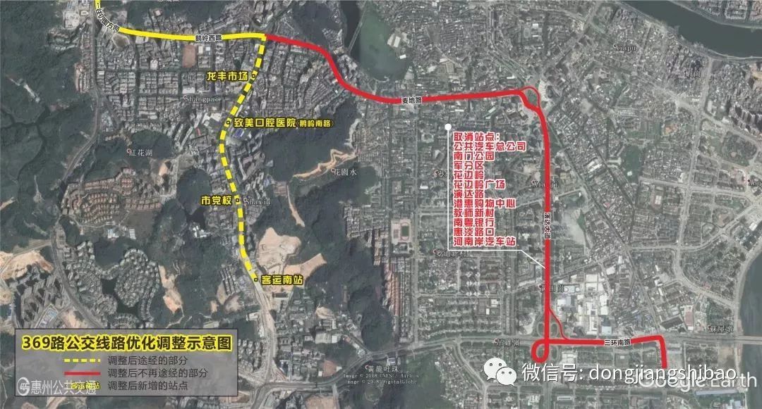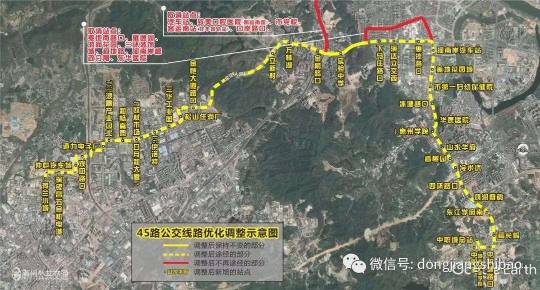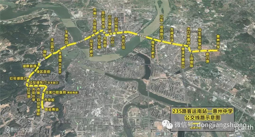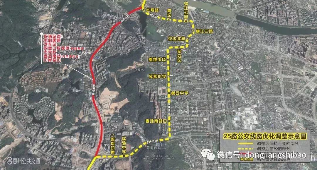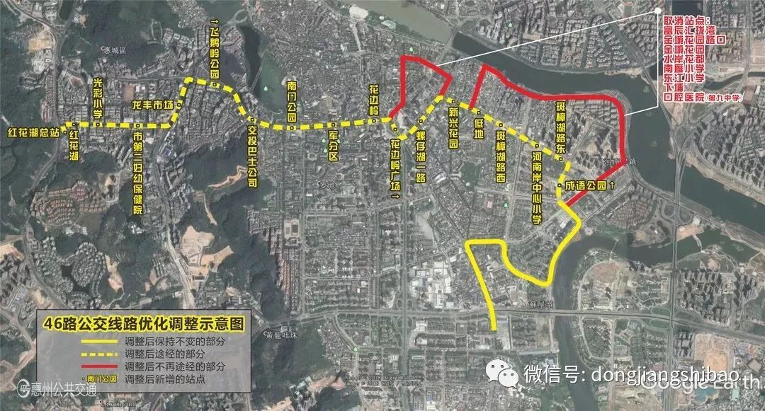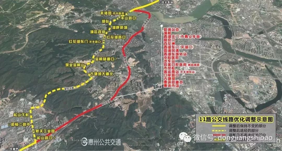 调整后:将取消原线路走向,重新调整由市客运南站始发,经鹅岭南路、鳄湖路、合生大桥、三新南路、云山西路、隆生大桥、惠泽大道至惠州中学