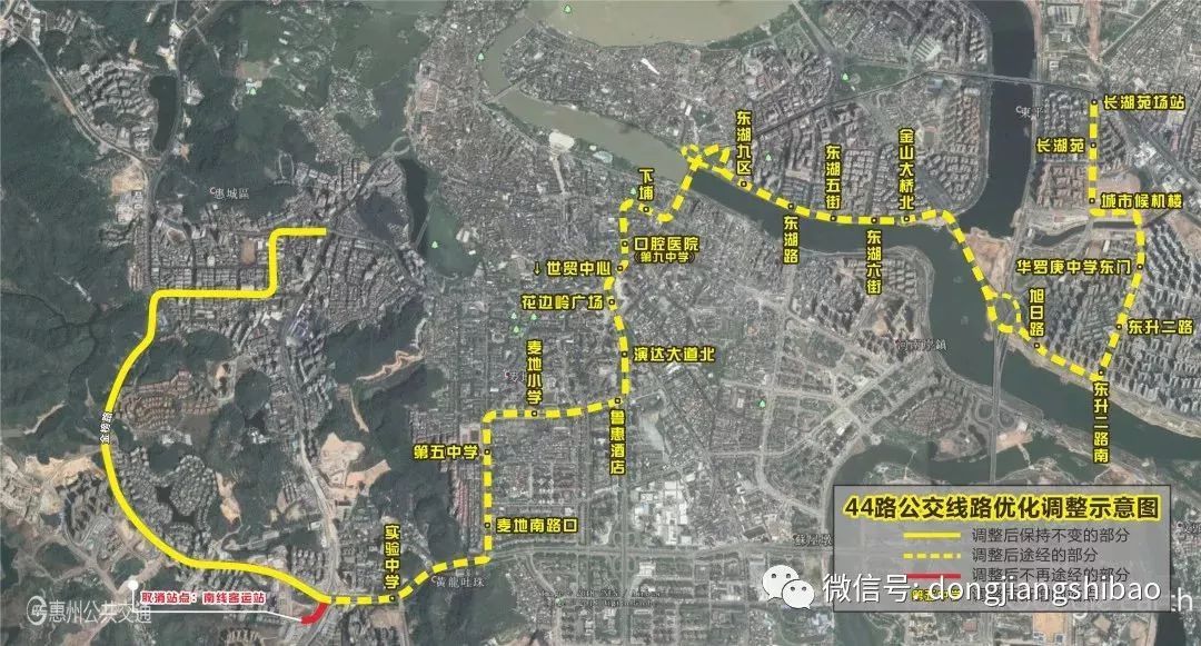 调整后:由金榜路口延伸经三环南路、麦地南路、演达大道、下埔南三街、西枝江桥、东湖路、金山大桥、东升二路、长湖东路至长湖苑场站。