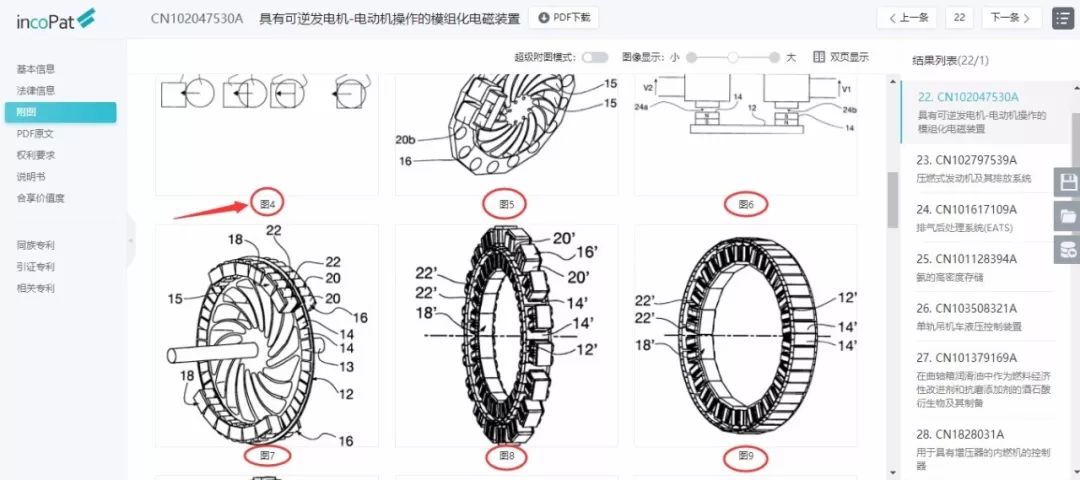 incoPat专利详情页面中的附图可查看专利相关附图信息。此次更新,附图下方新增了图号的显示功能,在页面中可以直观的看到每个附图在权利要求书中对应的编号,辅助用户快速了解和查看需要的附图。
