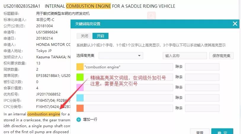 incoPat显示页面中的高亮功能,支持保存多组高亮词设置,并且支持除去噪音词,英文词组加英文引号可以实现精确高亮。 例如:高亮“发动机”,但是“发动机制”中包含“发动机”也会被高亮,那么可以在高亮词设置为“发动机”后,在除去词设置“发动机制”即可。 英文词组:engine brake,那么输入"engine brake"即为英文词组精确高亮。