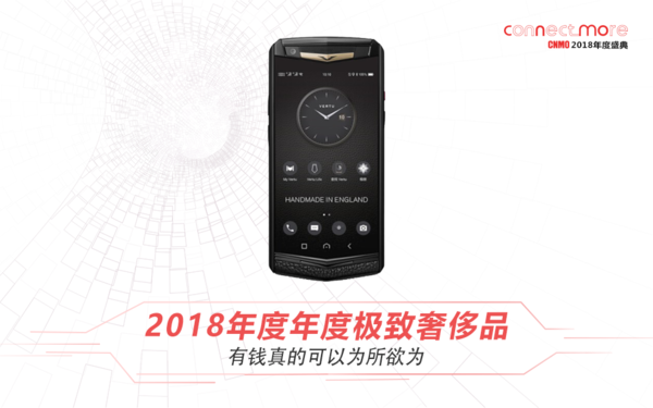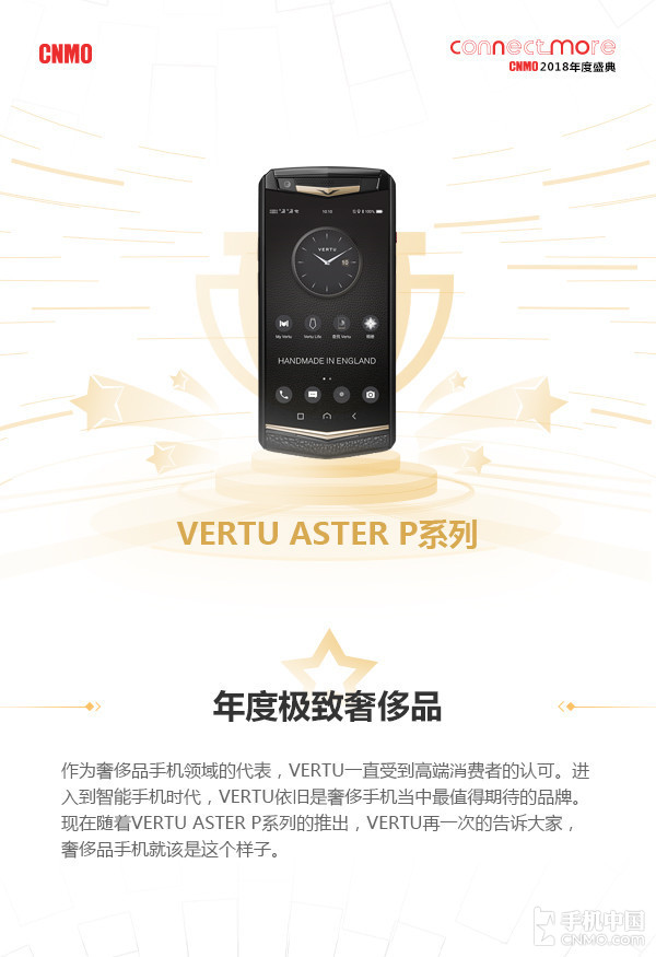 VERTU完美融合浪漫主义与奢华科技,用多样化的设计风格向极简主义发起挑战,为追求自我的精英圈层打造专属的艺术品;私人管家服务托出高级定制的内涵,让VERTU的品牌哲学高雅而又纯粹。为此,VERTU ASTER P系列获得CNMO 2018年度盛典“年度极致奢侈品”,实至名归。