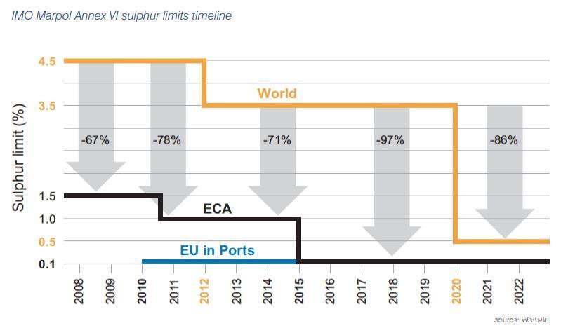 2020年1月1日起,IMO Marpol公约附则VI关于将船用燃料的硫含量不超过0.5%的规定将生效。国际海事组织Marpol公约附件VI“防止船舶造成空气污染”于1997年首次通过并于2005年生效,对船用燃料中的硫含量设定了限制,并在指定海域建立了ECA,确定了更严格的硫含量限制在0.1%。