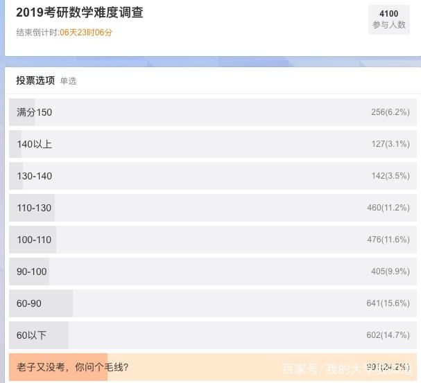 但是,具体难度的大小,还要看数据说话。网友发起了一个考研数学估分的投票,1小时之内,就有4000人参与了投票。在投票结果中,除去没有参与考研的991人,在考研的3109人中,数量最多的是“60-90”分这个选项,占考研投票总人数的20.6%,另外,“100-110”分,“110-130”分的人数也都不少,分别占考研投票总人数的14.78%和15.3%。有256人投了“满分”这个选项,占考研投票人数的8.2%,总体来说,估分100的人数占到了38.08%。