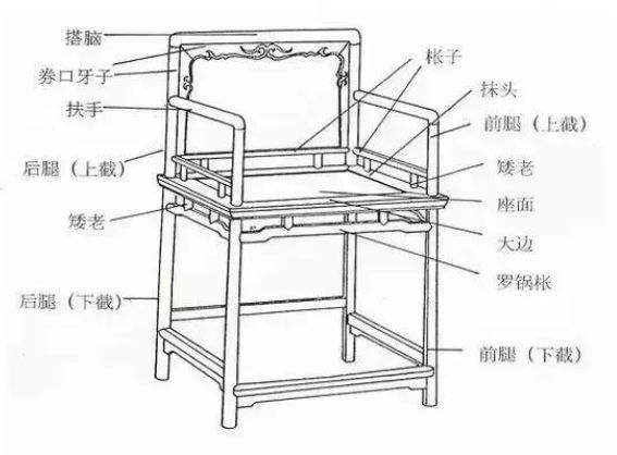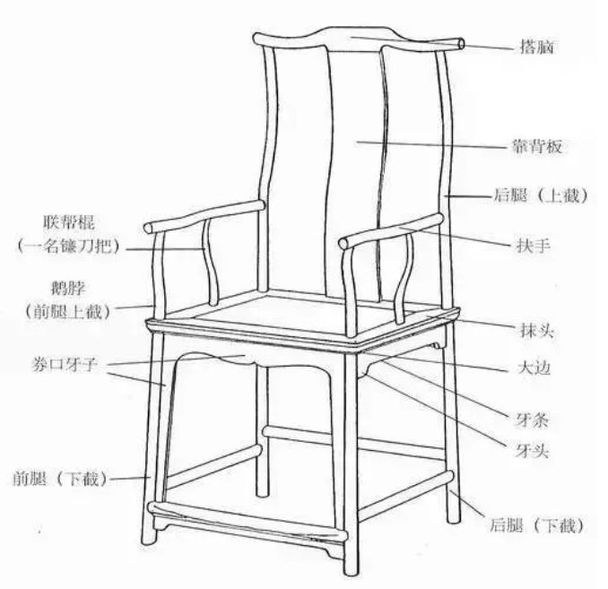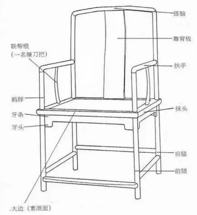 南官帽椅是明式家具中椅子的代表式样之一,因流行南方,故在“官帽椅”前加一个“南”字,以示区别。南官帽椅和“四出头官帽椅”的区别是“搭脑”的两端和两个扶手的前端均不出挑。