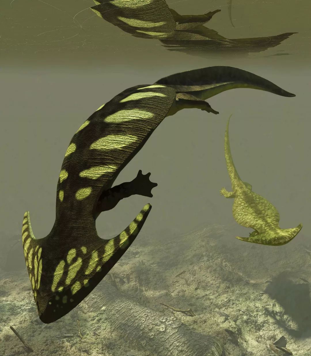 盗首螈艺术复原图,在二叠纪湖泊中游动,其极具特色的头部形状与回旋镖相似