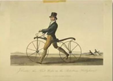 1816年,一名叫德莱斯的德国护林员,因为自己管理的林区太大,跑不过来,于是发明了一种能转向的木轮车,已经有了类似于自行车的结构,不过最大的问题是他的轮子不是靠机械驱动的,而是靠两个脚蹬地向前,类似这种: