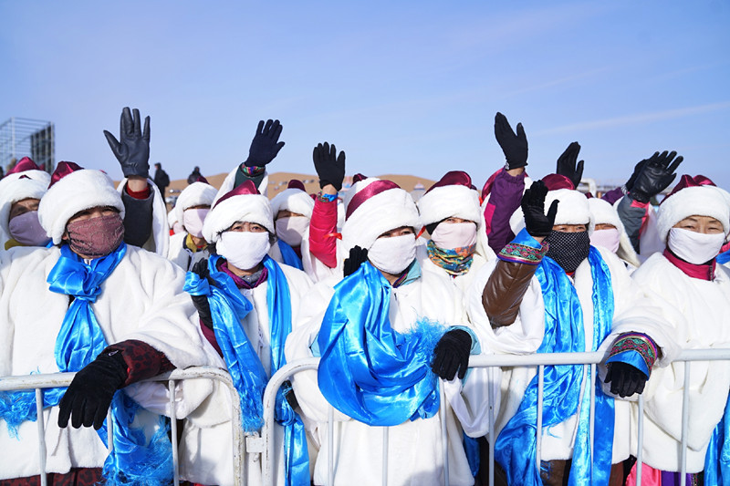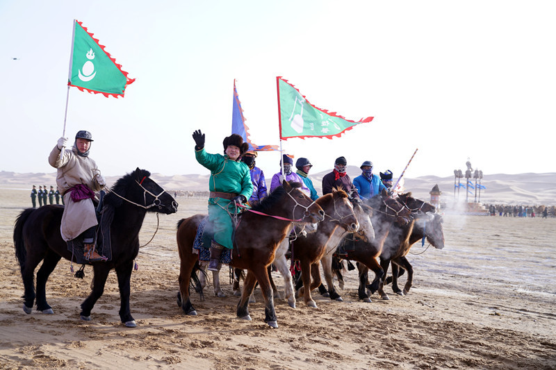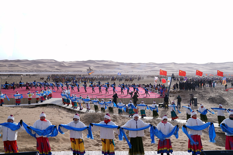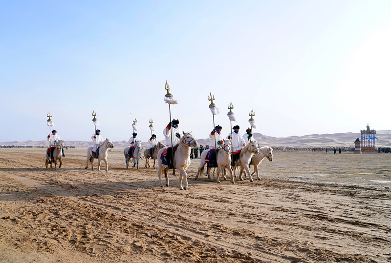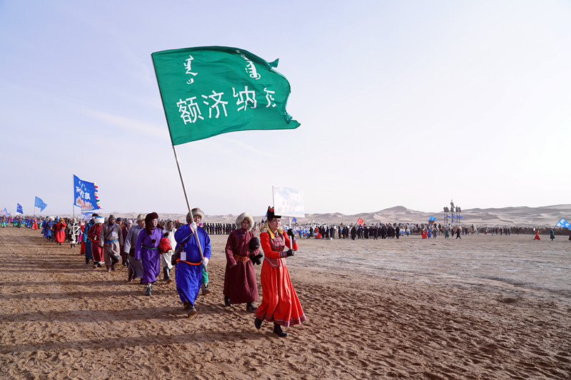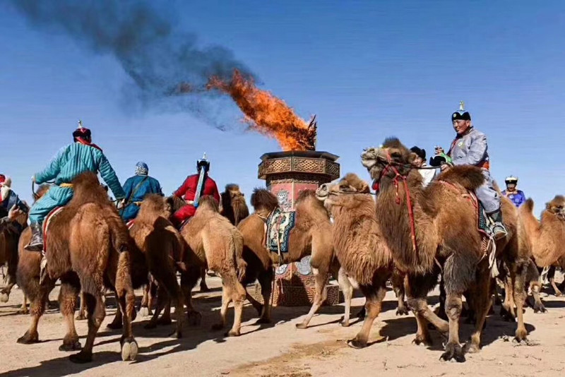 绚丽的服饰、圣洁的哈达、欢快的舞蹈、悠扬的歌声、灿烂的笑容......整个海骝其淖尔沉浸在欢乐与喜悦的氛围之中。来自各界的11个代表方阵依次步入会场,大会现场奏响起高亢激越的民族欢歌。上午十点整,伴随着那达慕圣火的点燃,洁白的骆驼接受洗礼,本届内蒙古骆驼那达慕暨阿拉善英雄会骆驼文化旅游节也正式拉开帷幕。