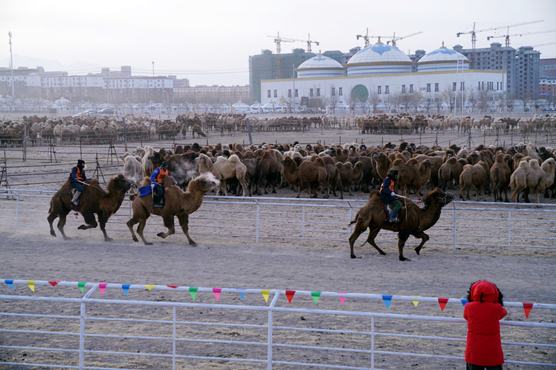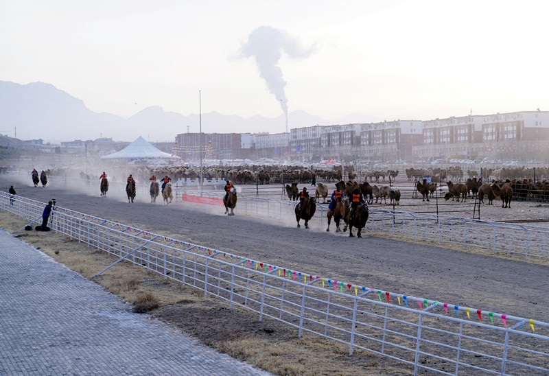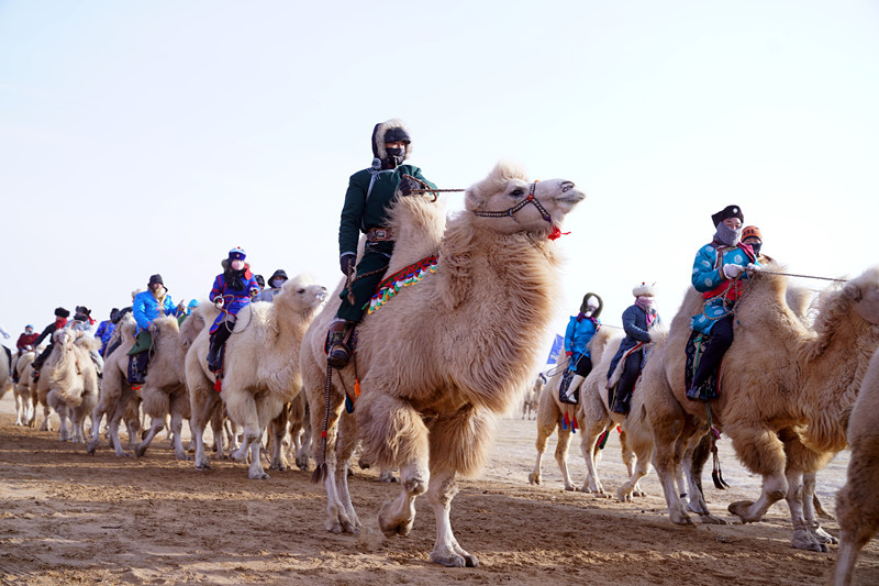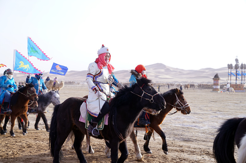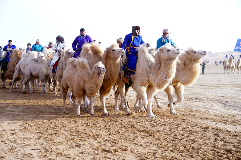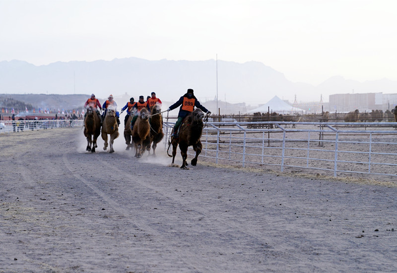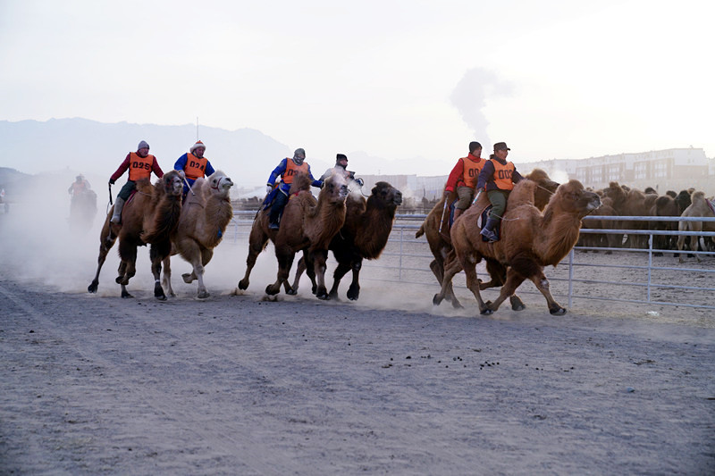 冬天的巴彦浩特赛驼场虽然低至零下20摄氏度,但激烈角逐的场面,让整个阿拉善都沉浸在一片沸腾之中。开幕式后,来自新疆、青海、甘肃、宁夏等省区及区内各盟市的赛驼代表队分别参加了5000米场地赛、4×2000米接力赛及骆驼评比等多项赛事。参赛者身着艳丽的民族服饰,驾驭着盛装打扮的骆驼走进赛场,昂首腾蹄、争相竞出,英姿飒爽好不威风。高大矫健的骆驼四蹄飞扬、奋勇争先,赢得了现场观众的阵阵喝彩。