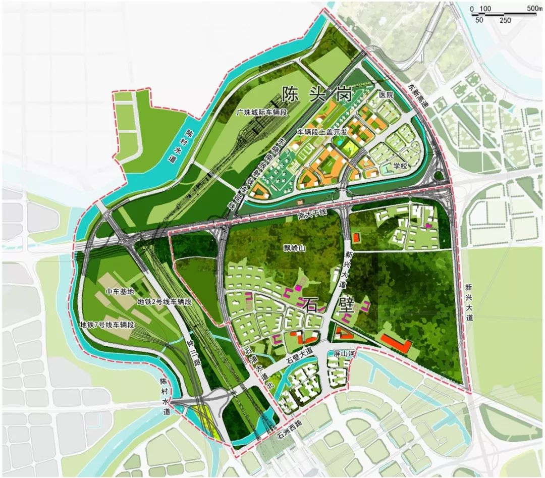 位置:番禺区西南部,西北至陈村水道,南至石洲西路,东至东新高速,其中陈头岗组团面积为536.74公顷,石壁组团面积为340.59公顷。