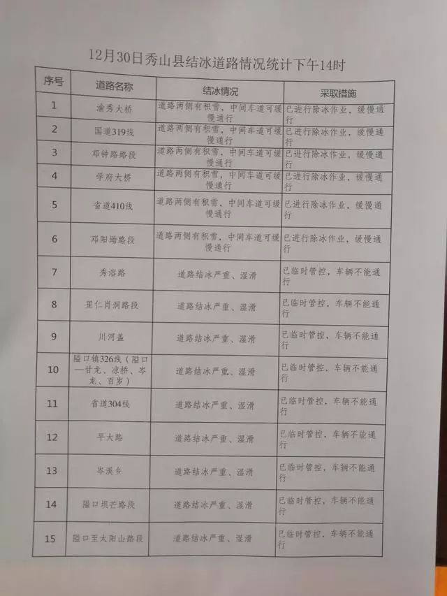 12月30日秀山县结冰道路情况统计表