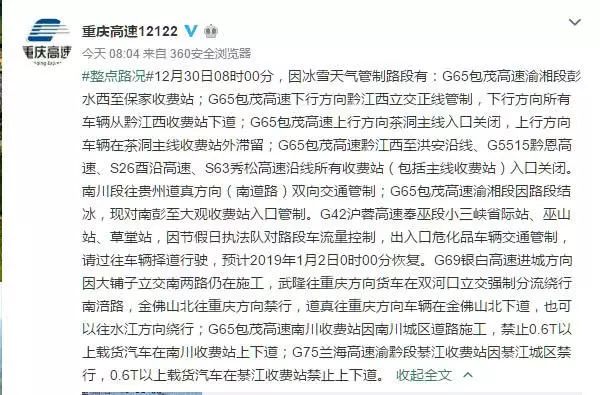 据湖南、贵州高警预计明天(2018年12月31日)下午才能恢复通行;前期进入渝东南片区(南川、武隆、彭水、黔江、酉阳、秀山)的所有车辆全部滞留沿线区县,根据气象预警显示,今日夜间气温将持续走低,建议准备前往湖南、贵州方向的车辆(尤其是客危车辆)择道通行,避免积压劝返。