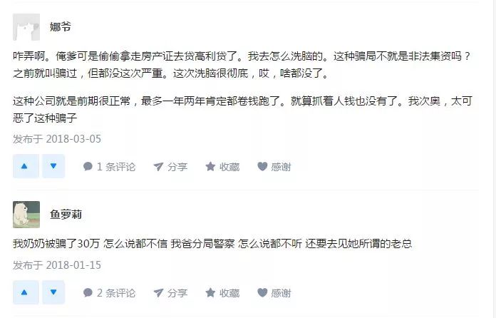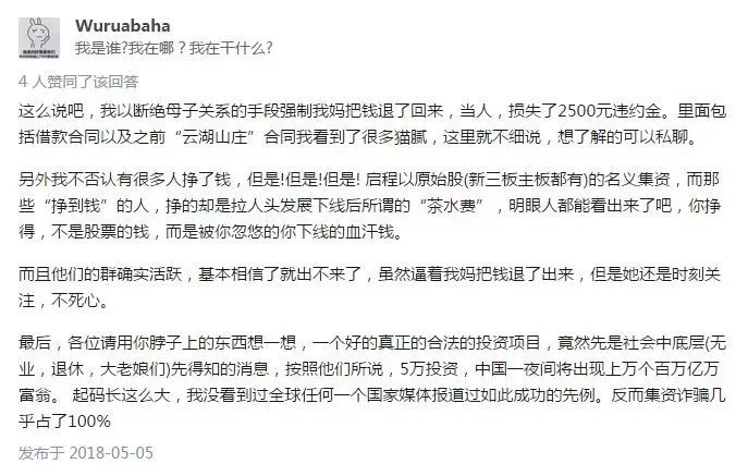 查询该公司详细运作模式,资料非常有限,非常低调,微信公众号也很难查到该公司的投资分红的详细信息,只有天涯上有个质疑的帖子。这也是该公司的狡猾之处,闷声发大财,骗子高调早挨打。先贴上天涯帖子: