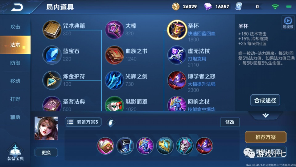 圣杯这件装备,一般都是很耗蓝的英雄要出的装备,当然了多数都是法师出,但是呢,这些英雄又不屑出这件装备,导致中后期以后,等级上去了,不怎么耗蓝,这件装备就被抛弃了,现在圣杯新增了一个属性,当英雄法力值(蓝条)是满的状态下,圣杯不给你回蓝了,给你回生命值,而且回的还贼多,每5秒回复5%的最大生命值,这难道是没蓝条英雄的福音?价格从1930降到了1800。