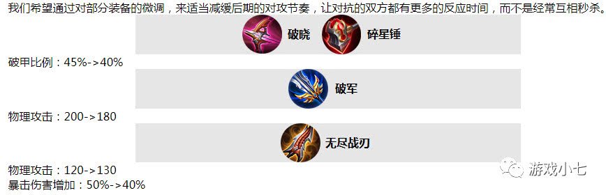 物理穿透系列的装备,破晓、碎星锤,一个是射手的神器,一个是近战英雄的神器,这2件装备,从45%物理穿透效果,砍到了40%的物理穿透效果。