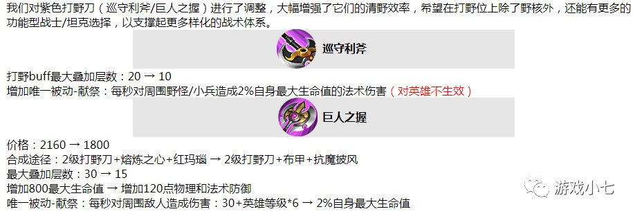 打野装备也调整了,低配版的巡守利斧原本可以叠加到20层,现在改成了只能到10层,装备合成到顶级巨人之握之后,最高也只能叠加15层了,只能对野怪、小兵生效。价格从2160调整1800,巨人之握还新增了120点双抗防御。