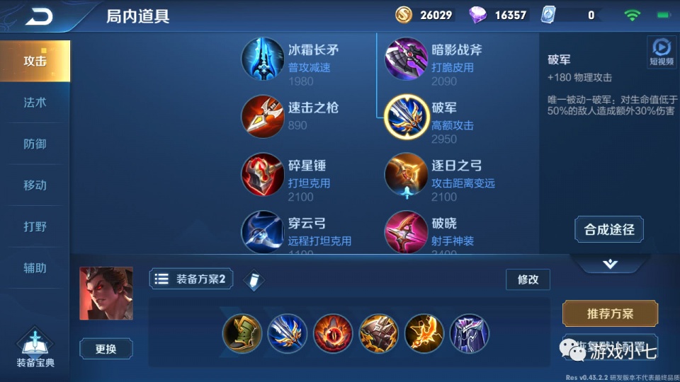 破军这把武器是攻击装备里物理攻击加的最多的一把神器,有些英雄第一把武器就出破军,有些英雄到中后期才出破军,这次破军200点的物理攻击被调整到了180点物理攻击了。