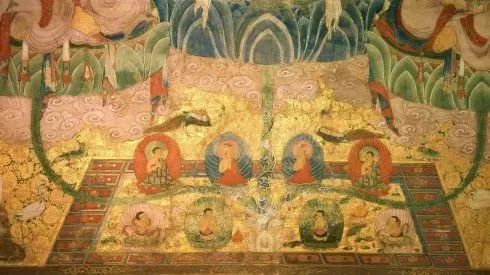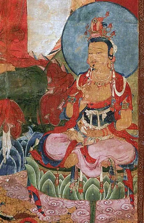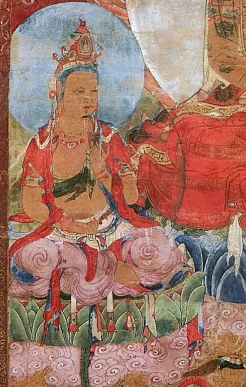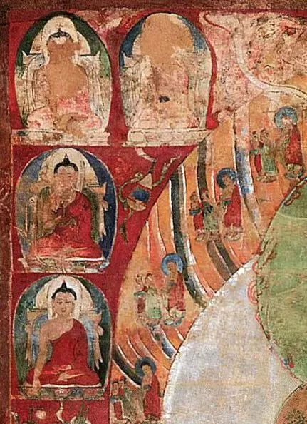 画幅左右两下角各画一供养比丘,右下角的比丘年纪较轻,身穿右袒式袈裟,肤色黝黑,可能是一位西藏僧人。右下角的比丘白发苍苍,内着红色福田衣,外罩黄色大衣。从其服饰观之,这位出家人也应是一位吐蕃僧人。画幅的上方和主尊五彩背光的两侧,共画八尊西藏样式的坐佛,姿势相同,但手印不一。可能分别代表六位过去佛、现在佛和未来佛。这种代表三世的八佛在西藏十一、二世纪的画作中时有出现。