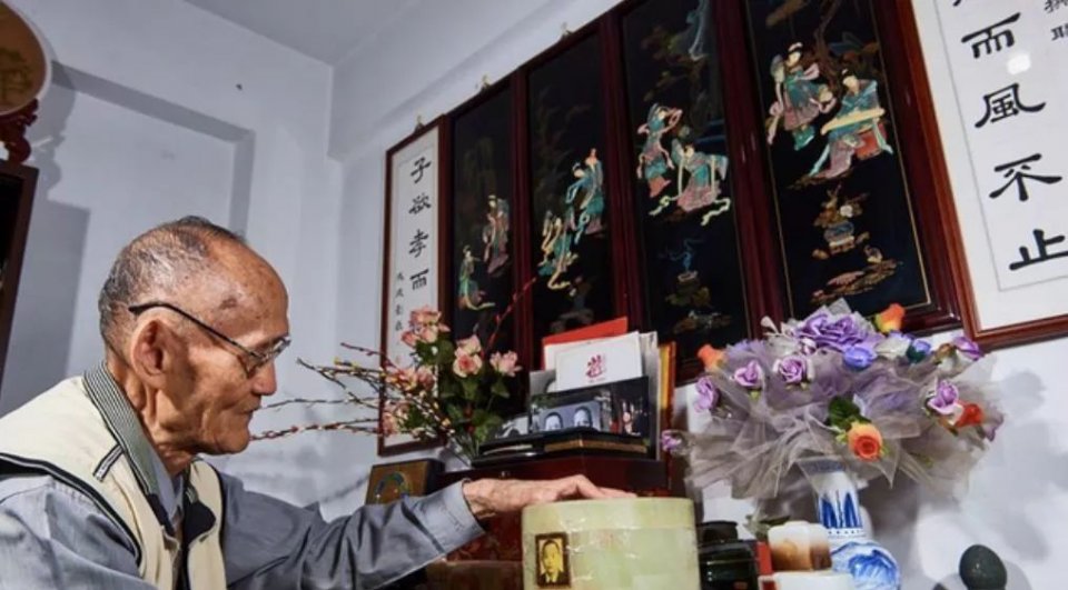 △2017年11月14日,高秉涵在擦拭一位老兵的骨灰坛。(图自新华社)
