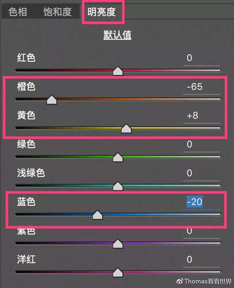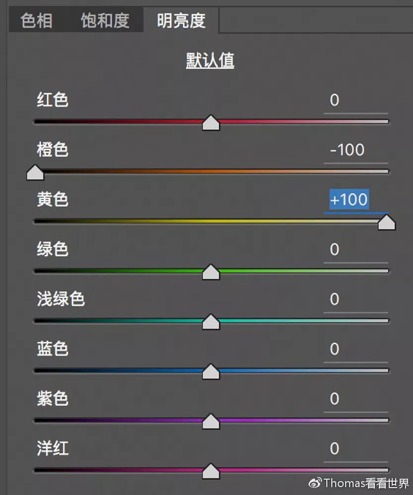 最后一个 HSL 面板是明亮度面板,明亮度滑块右移,该颜色变暗变黑,滑块左移,该颜色变亮变白。