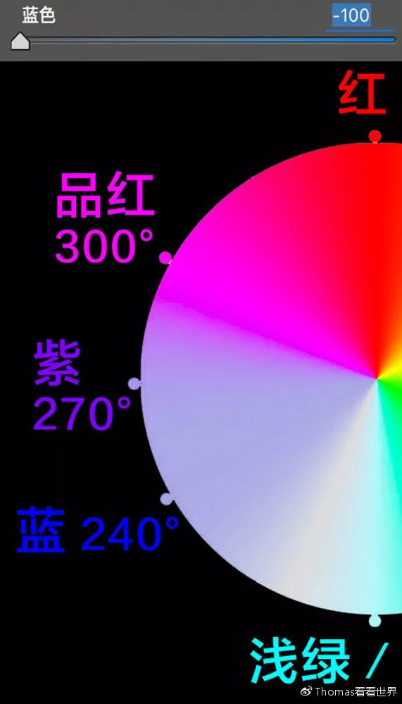 色相滑块往右移(加数值),颜色会在色环中顺时针偏色。色相滑块往左移(减数值),颜色会在色环中逆时针偏色。