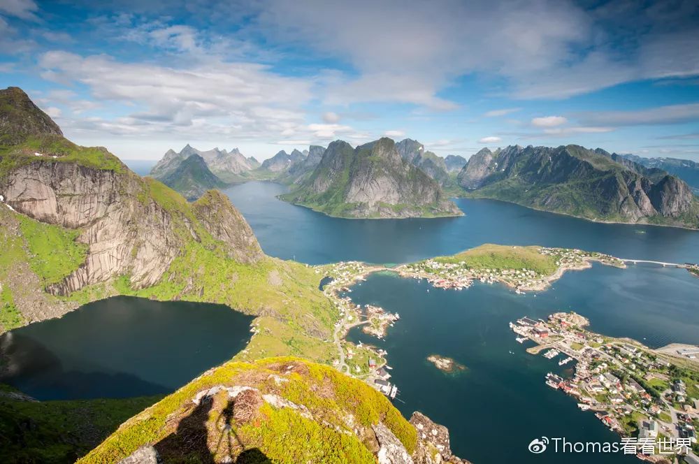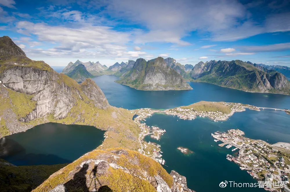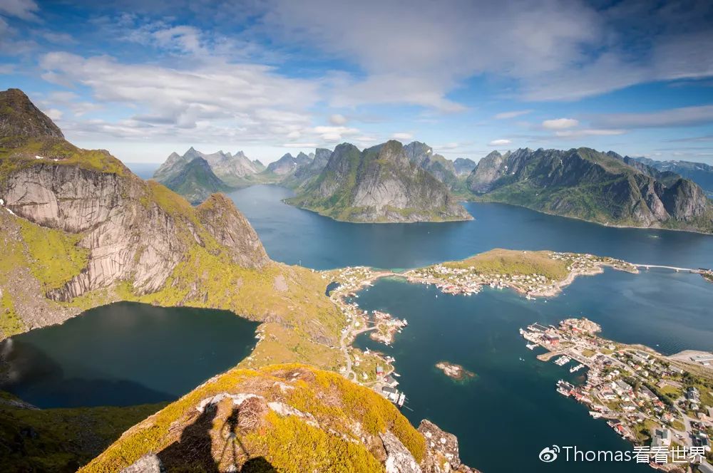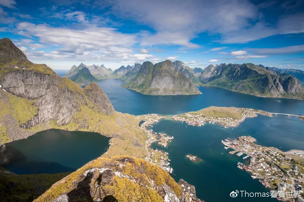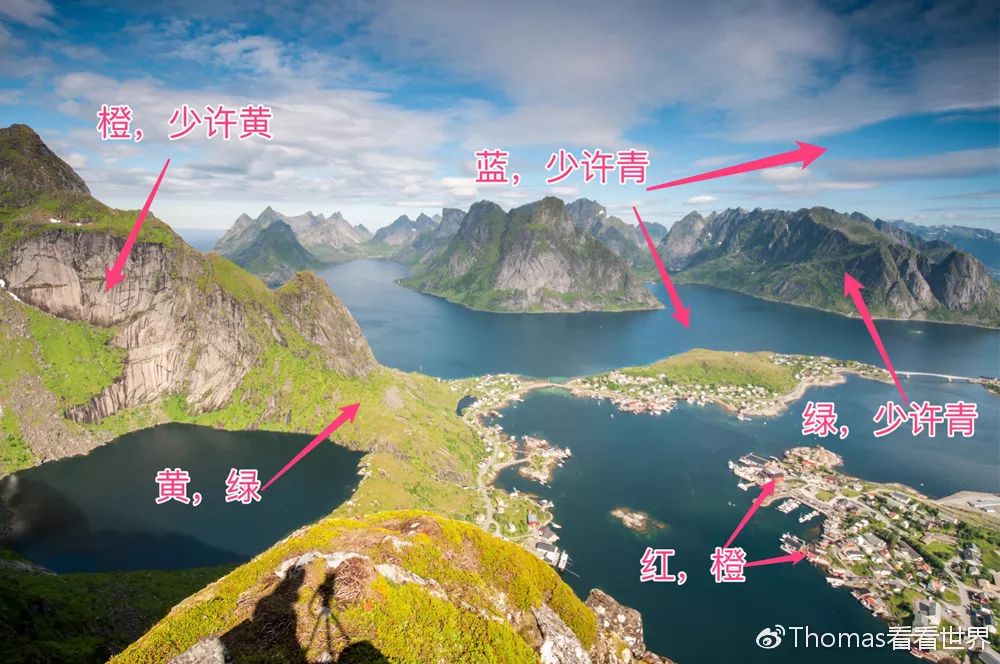 山体上裸露岩石,主要是橙色,以及少量黄色构成。天空和水面,主要颜色是蓝色和少量青色。地面上星星点点的红色小木屋,实际上受到红色和橙色共同作用。
