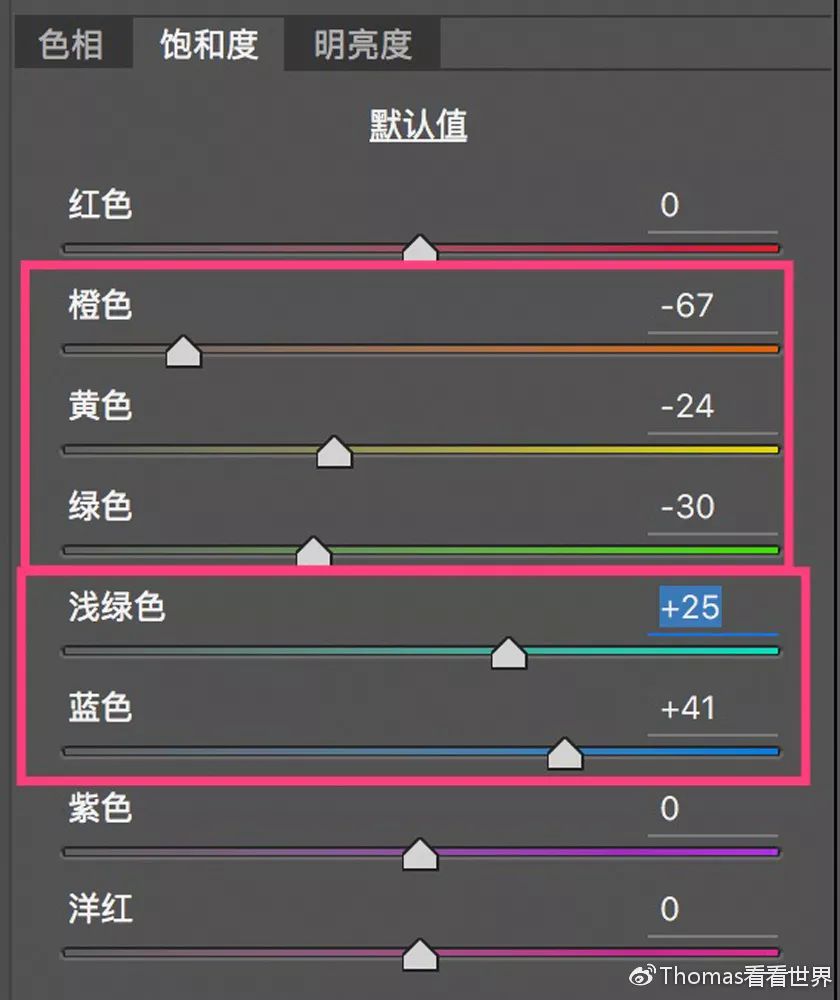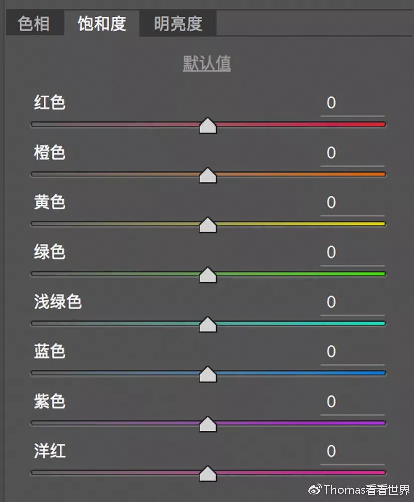 HSL 中的饱和度面板很好理解。饱和度滑块右移,该颜色的浓度纯度增加。饱和度滑块左移,该颜色变灰变淡。