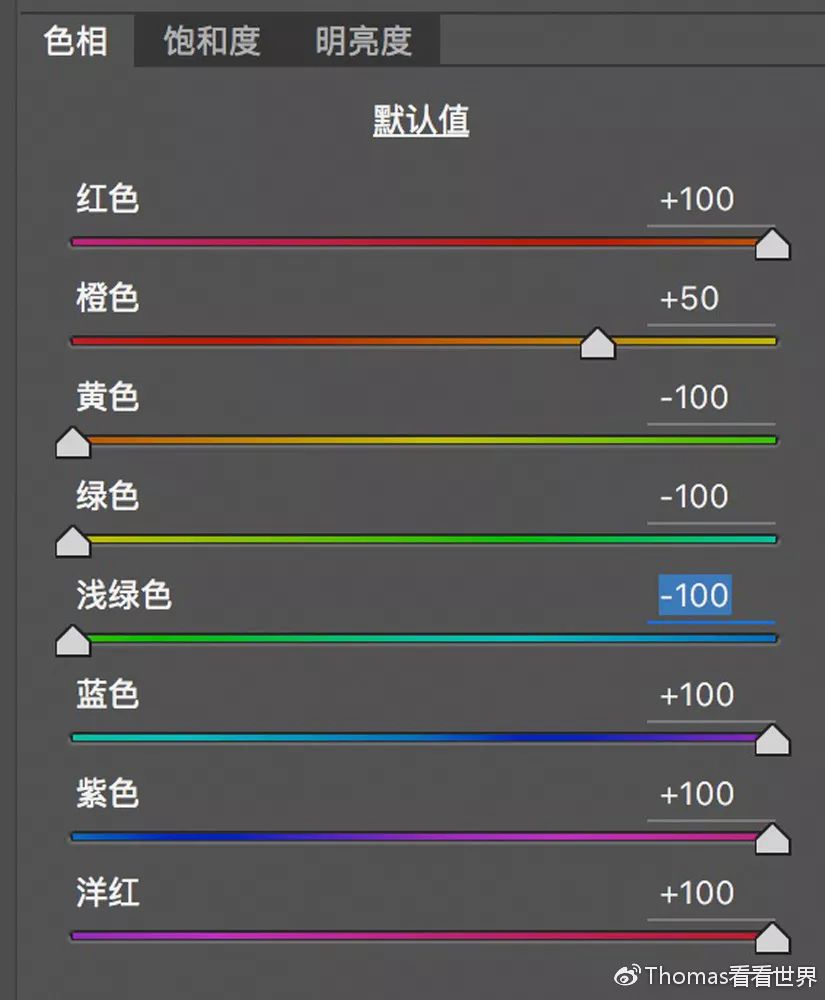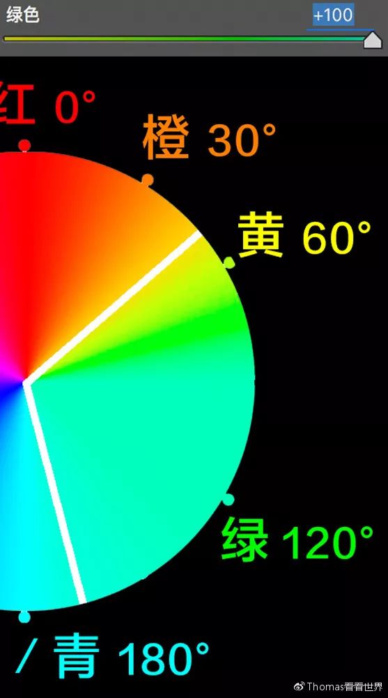 如果我们在色相面板里,把绿色变成 +100。色环中绿色以及周边色相,就全部往青色色相偏移。