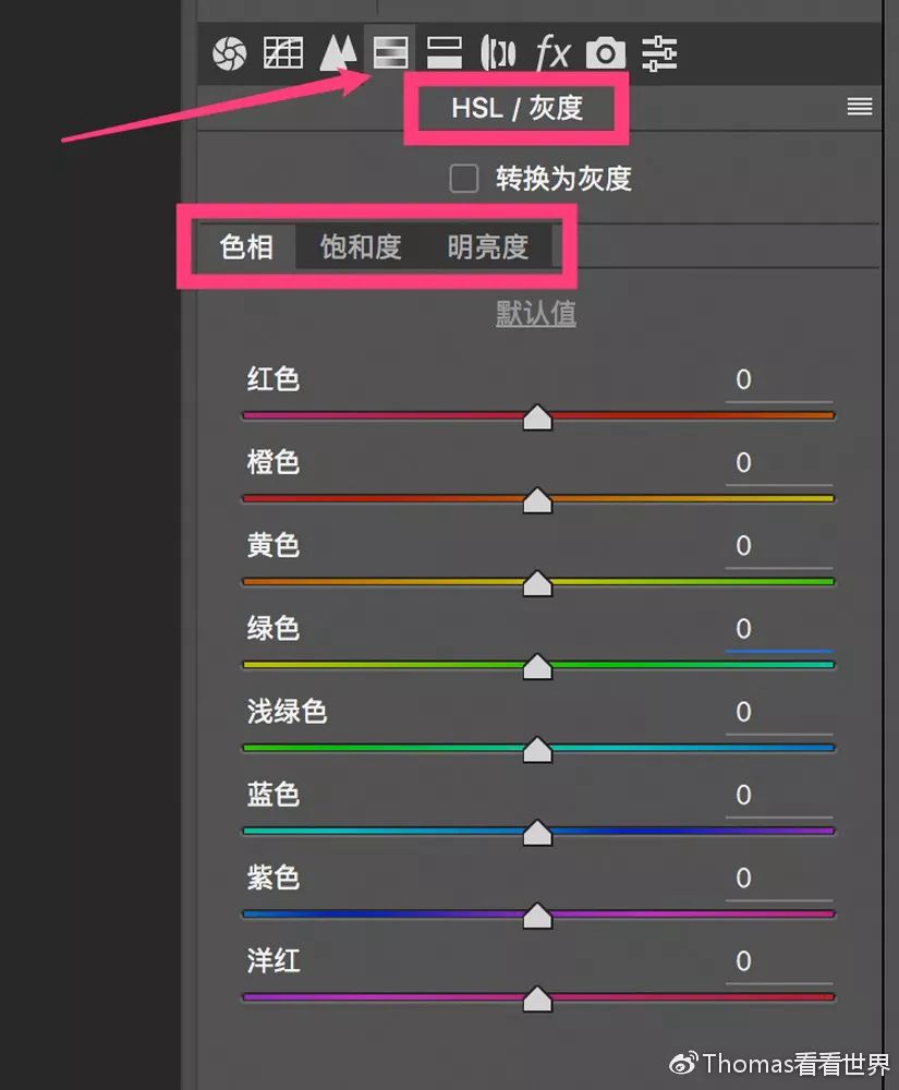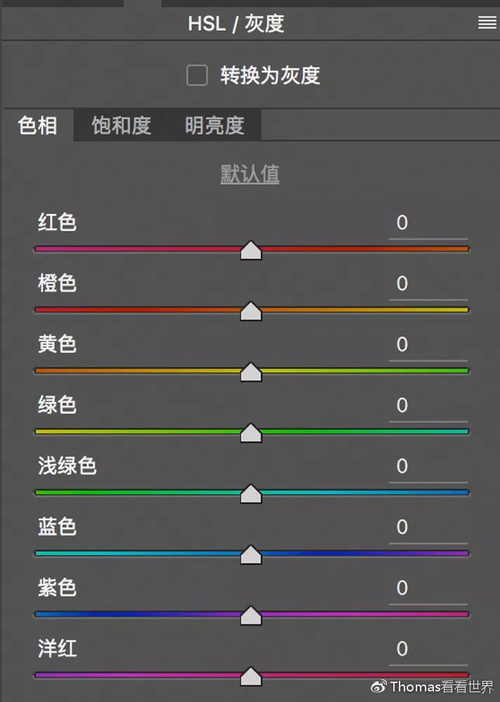 HSL 面板由色相、饱和度、明亮度三个子面板组成。每个子面板中有 8 个滑块,分别可以对应调整图像中的 8 种色彩。