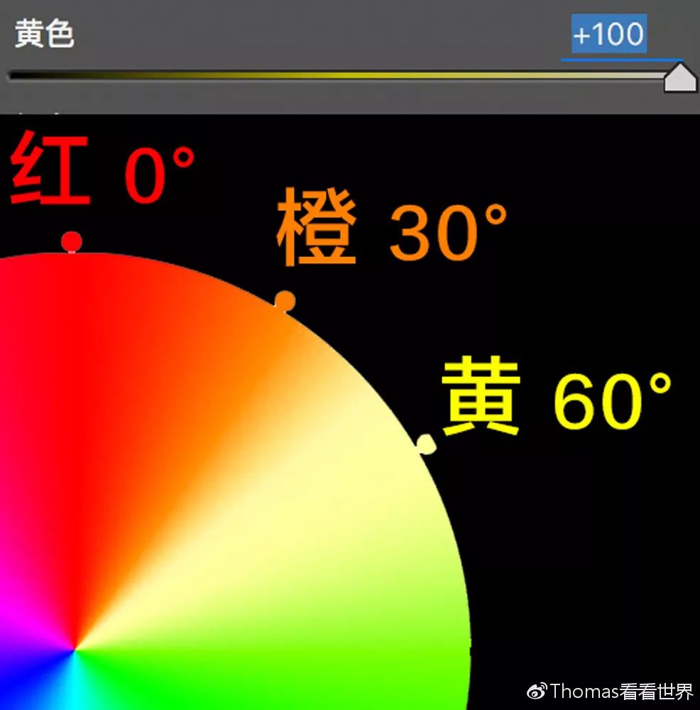 比如我把黄色的明亮度滑块移动到 +100,可以看到色环中的黄色变亮了。