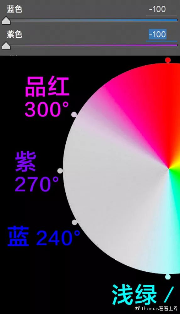 如果我在饱和度面板中,把紫色滑块的饱和度也减到 -100,可以看到原来色环上整片的蓝紫色区域,都变成了纯灰色。