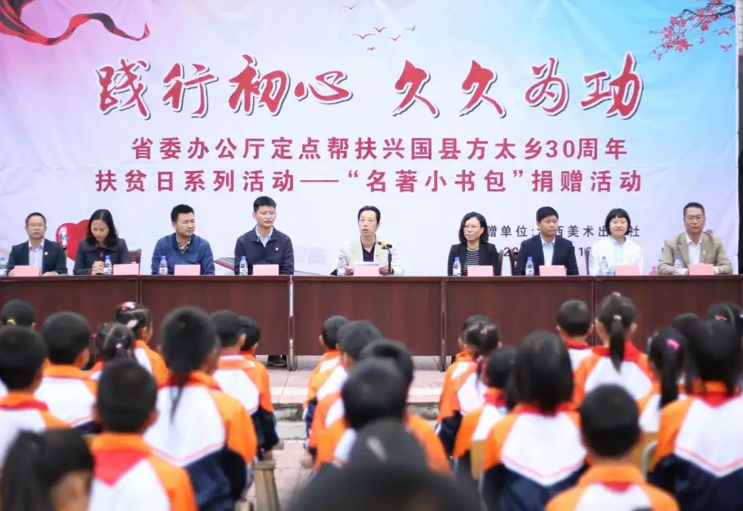名著小书包捐赠仪式作为“践行初心,久久为功——省委办公厅定点帮扶兴国县方太乡30周年扶贫日系列活动”的活动现场。